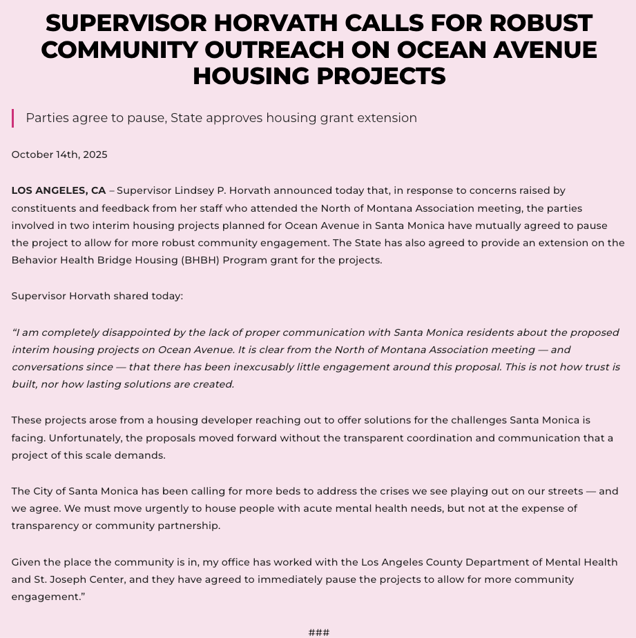 Yesterday, LA County Supervisor Lindsey Horvath announced that, "in response to concerns raised by constituents" at our NOMA meeting last Thursday, the two mental health facilities on Ocean Avenue will be paused "to allow for more community engagement." The announcement is below.